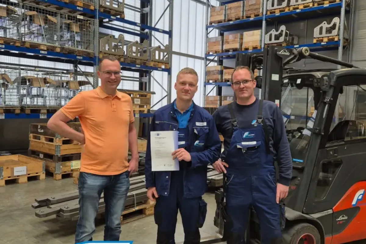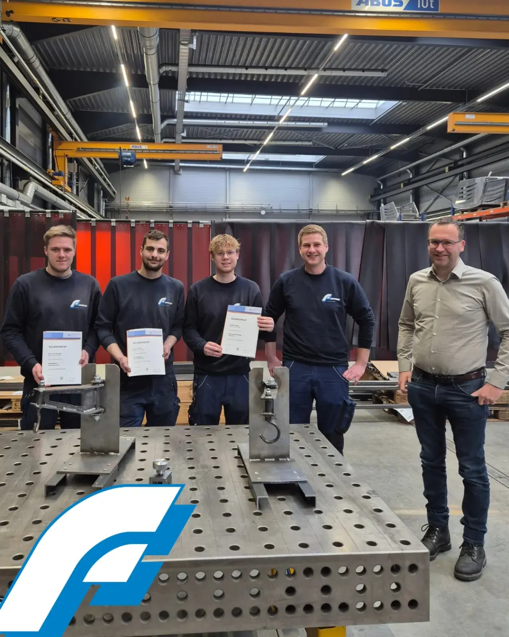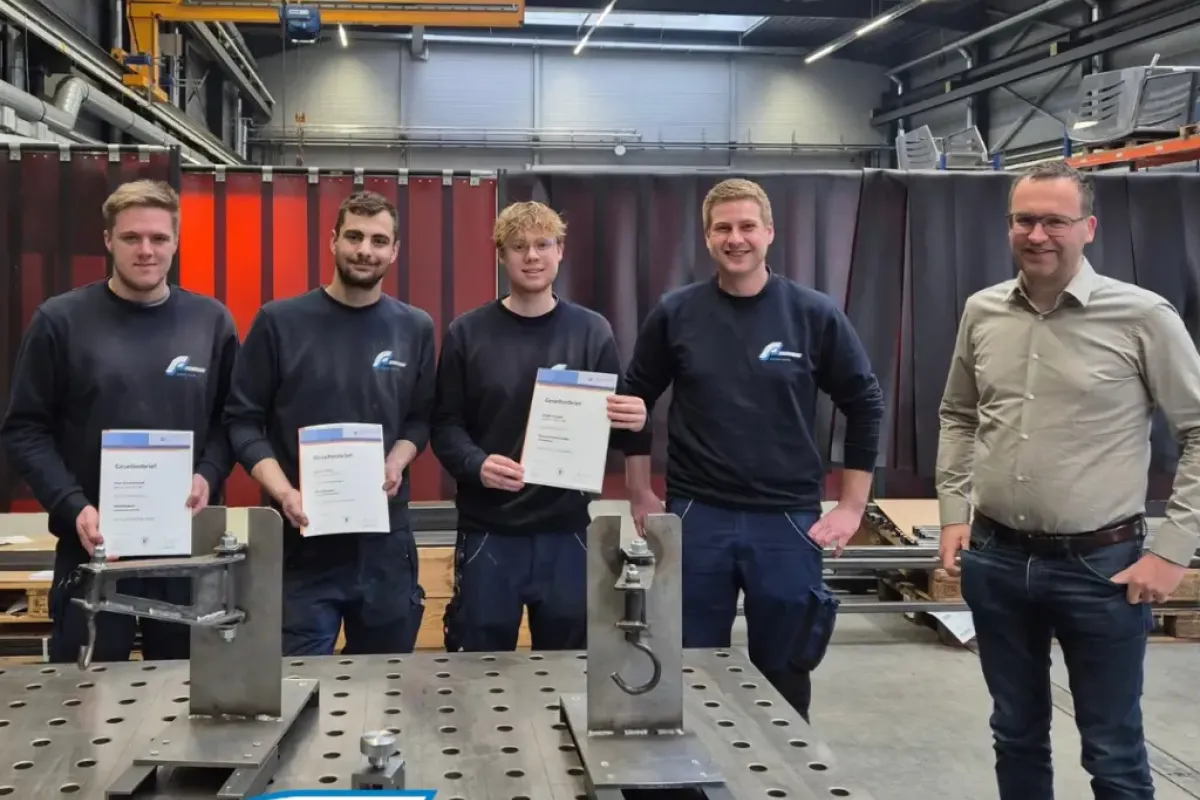 Geschäftsführer Thomas Fischer, Ausbildungsleiter Marvin Maier und Rolf Zinser sind stolz auf ihre „ehemaligen“ Azubis! Max Schwarzkopf und Lukas Kibler haben ihre Prüfung zum Metallbauer erfolgreich bestanden, Gregor Angele ist nun offizieller Feinwerkmechaniker und Paul Weber kann sich nun stolz „Fachkraft für Lagerlogistik“ nennen. Alle vier können den Gesellenbrief stolz in den Händen halten!